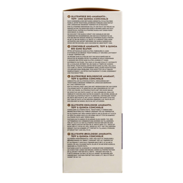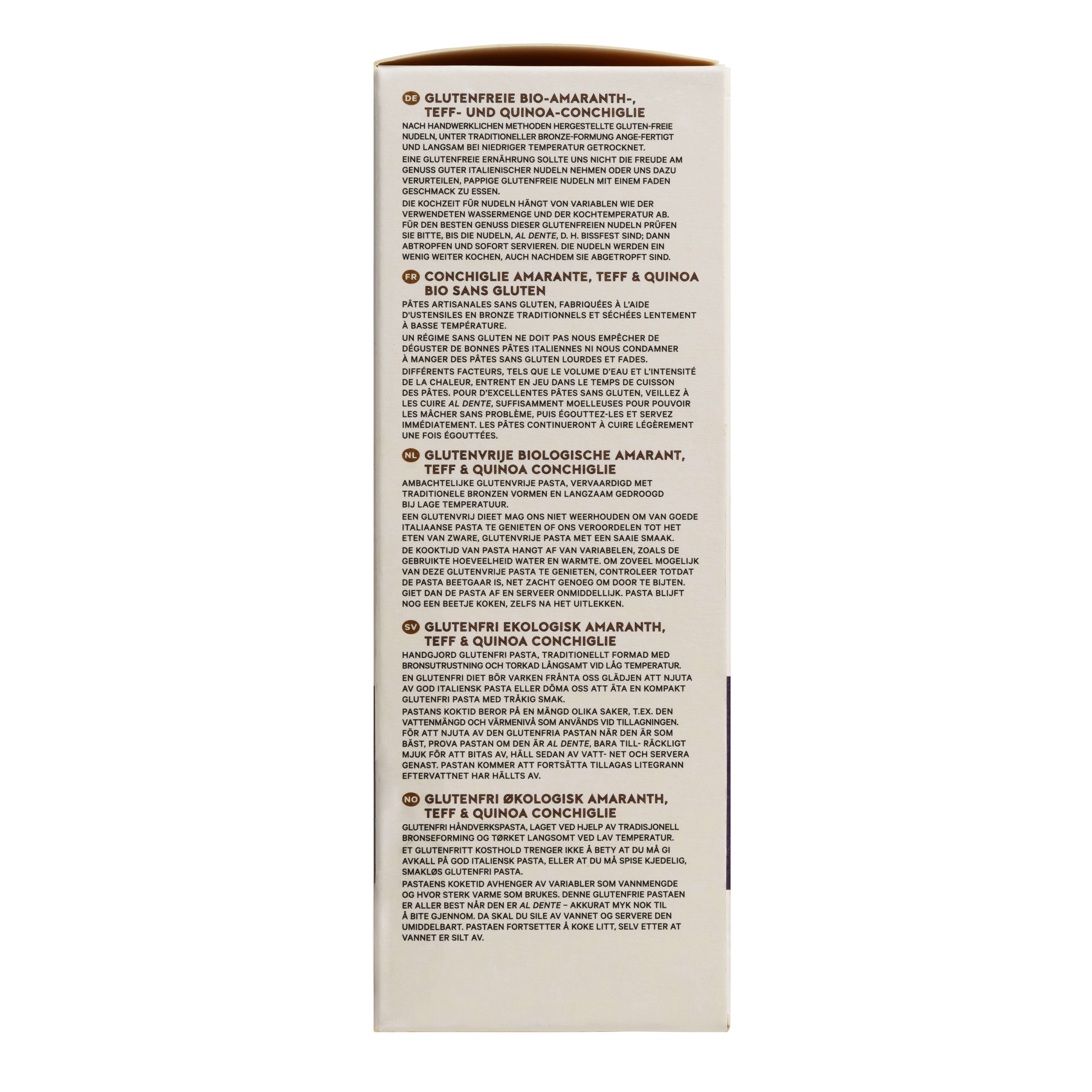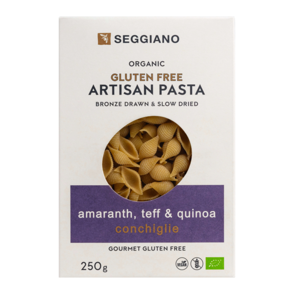 A gluten free, organic shell pasta made with amaranth, teff, and quinoa. Richly flavoured and artisan crafted using ancient grains.
